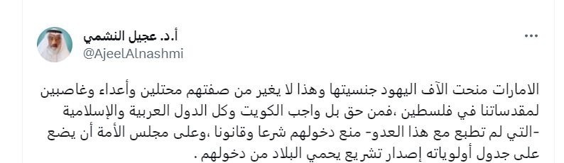وقال عجيل النشمي في تدوينة على منصة "إكس" تويتر سابقاً، يوم أمس الإثنين، إن "الامارات منحت آلاف اليهود جنسيتها وهذا لا يغير من صفتهم محتلين وأعداء وغاصبين لمقدساتنا في فلسطين".