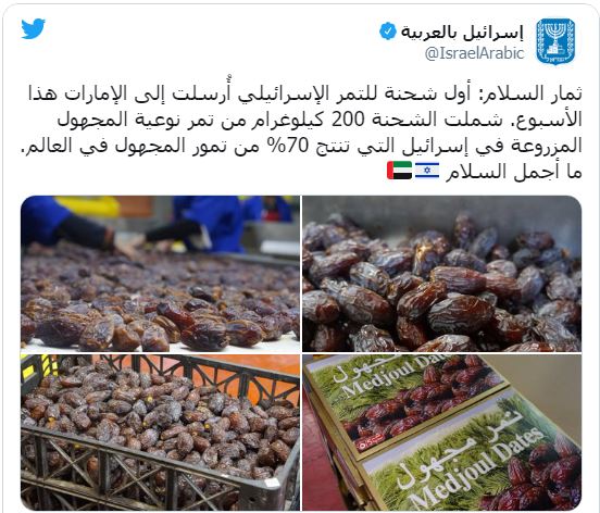 ونشرت صفحة "إسرائيل بالعربية" الناطقة بلسان وزارة الخارجية الإسرائيلية تغريدة جديدة على صفحتها الرسمية في "تويتر"، أكدت من خلالها وصول أول شحنة للتمر الإسرائيلي أُرسلت إلى الإمارات هذا الأسبوع.