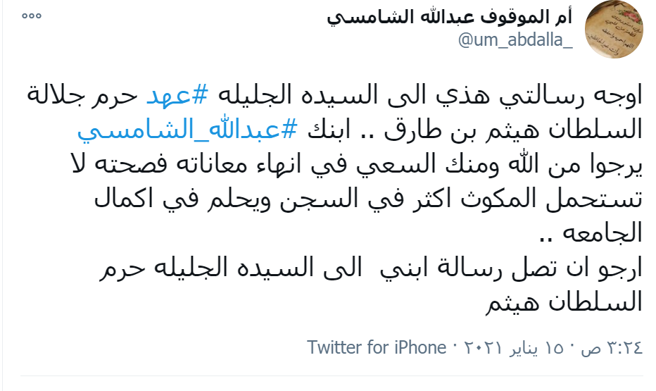 وقالت والدة الشامسي، في تغريدة على تويتر رصدها موقع "الامارات71": “أوجه رسالتي إلى السيدة الجليلة عهد حرم جلالة السلطان هيثم بن طارق، ابنك عبدالله الشامسي يرجوا من الله ومنك السعي في إنهاء معاناته”.