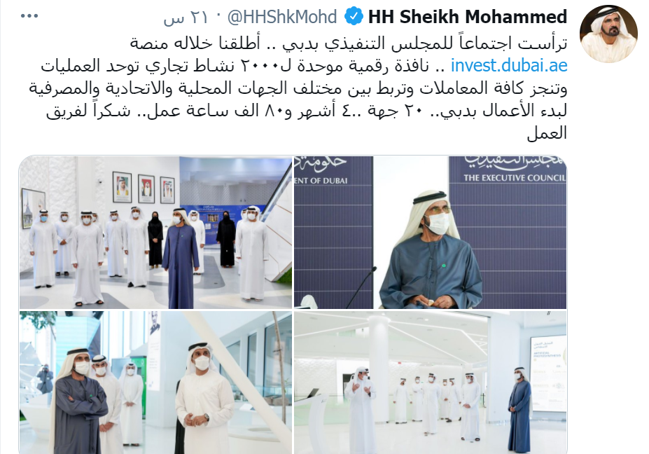 وقال الشيخ محمد في حسابه الرسمي على موقع التواصل الاجتماعي "تويتر": "نافذة رقمية موحدة لـ 2000 نشاط تجاري توحد العمليات وتنجز كافة المعاملات وتربط بين مختلف الجهات المحلية والاتحادية والمصرفية لبدء الأعمال بدبي.. 20 جهة .. 4 أشهر و80 ألف ساعة عمل شكراً لفريق المجلس".