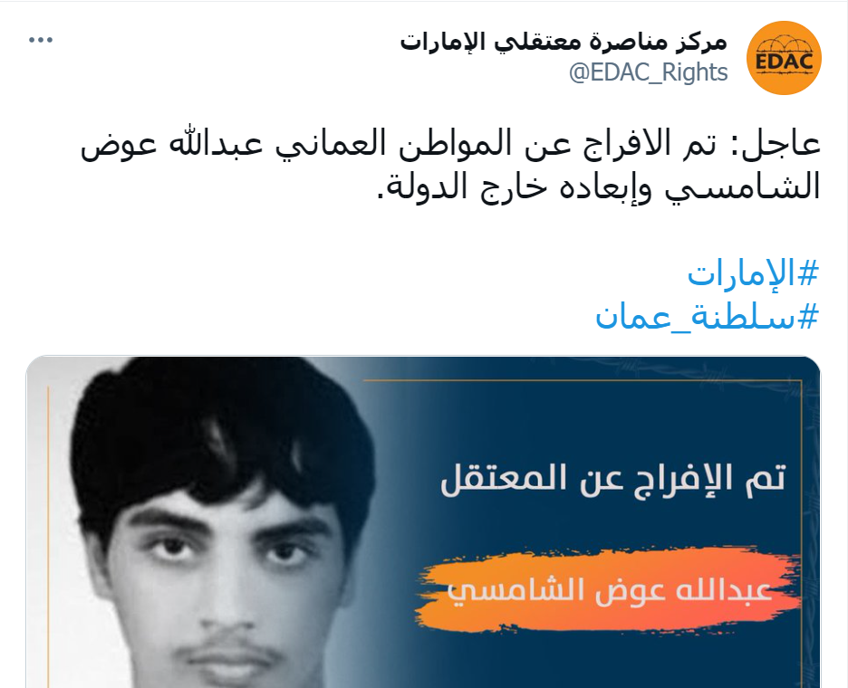 ونشر المركز في تغريدة عبر حسابه بتويتر صورة عبدالله الشامسي، وعلق عليها بالقول:” عاجل: تم الافراج عن. المواطن العماني عبدالله عوض الشامسي وإبعاده خارج الدولة.”