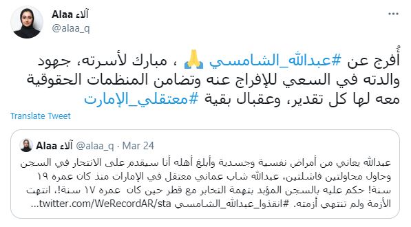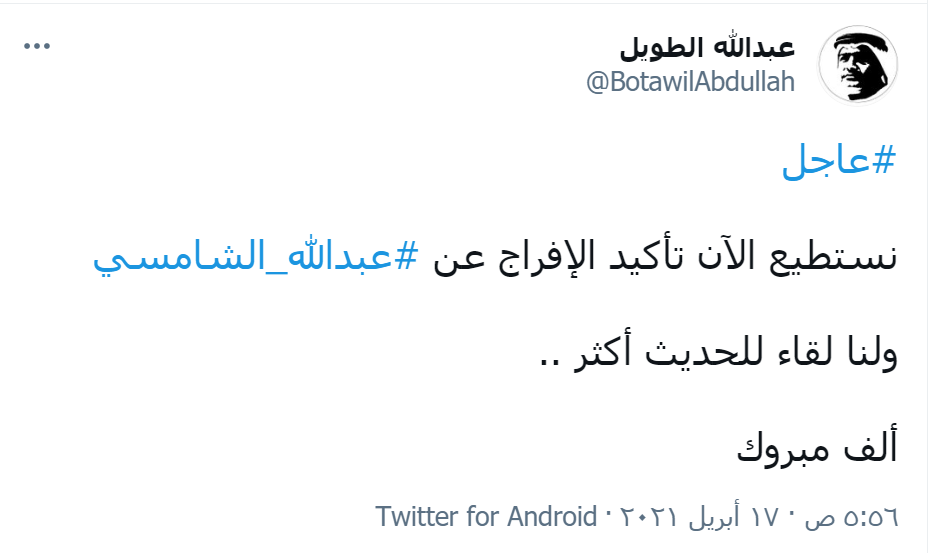 من جانبه، أكد الناشط الإماراتي عبدالله الطويل، خبر افراج أبوظبي عن المعتقل "عبدالله الشامسي برفقة عمه، كما تم ابعاده عن الدولة".