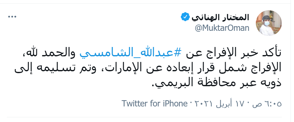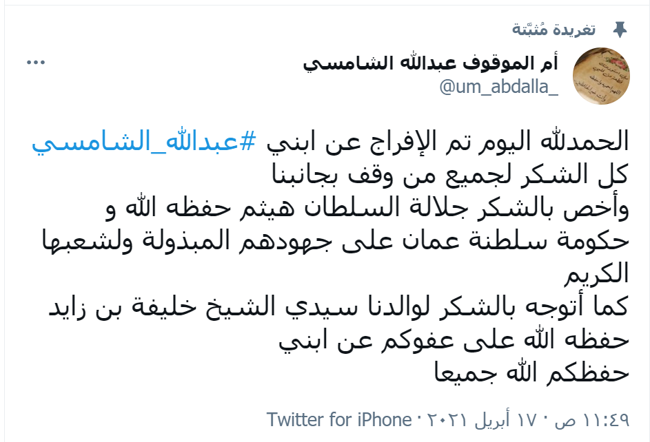 وقالت أم الموقوف الشامسي، عبر تغريدة على "تويتر": الحمدلله اليوم تم الإفراج عن ابني عبدالله الشامسي، كل الشكر لجميع من وقف بجانبنا وأخص بالشكر جلالة السلطان هيثم حفظه الله و حكومة سلطنة عمان على جهودهم المبذولة ولشعبها الكريم، كما أتوجه بالشكر لوالدنا سيدي الشيخ خليفة بن زايد حفظه الله على عفوكم عن ابني".