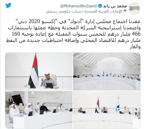 وقال ولي عهد أبوظبي الشيخ "محمد بن زايد"، إنه تم اعتماد استراتيجية شركة "أدنوك" المحدثة وخطة عملها باستثمارات 466 مليار درهم للخمس سنوات المقبلة.