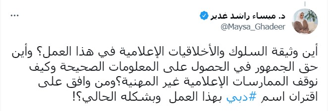 ومضت تتساءل: " أن وثيقة السلوك والأخلاقيات الإعلامية في هذا العمل؟ وأين حق الجمهور في الحصول على المعلومات الصحيحة وكيف نوقف الممارسات الإعلامية غير المهنية؟ ومن وافق على اقتران اسم دبي بهذا العمل وبشكله الحالي؟