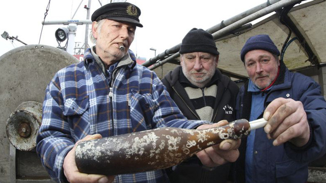 صياد سمك ألماني من مدينة كيل في شبكته التي أخرجها من بحر البلطيق قارورة مختومة فيها