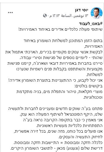 وشدد على أنه وقادة المستوطنين يعملون منذ سنين على تعزيز قطاعي الصناعة والأعمال داخل المستوطنات. وختم منشوره قائلا: اقتصاد قوي ومستقر يساوي استيطان قوي ومستقر. ووجه دغان تحياته إلى المستوطنين في شمال الضفة الغربية.