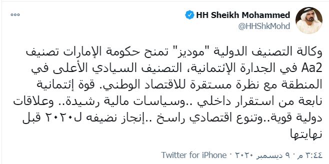 وأضاف حاكم دبي في تغريدة نشرها على حسابه في "تويتر" أن هذا التصنيف السيادي هو الأعلى في المنطقة، مع نظرة مستقرة للاقتصاد الوطني.