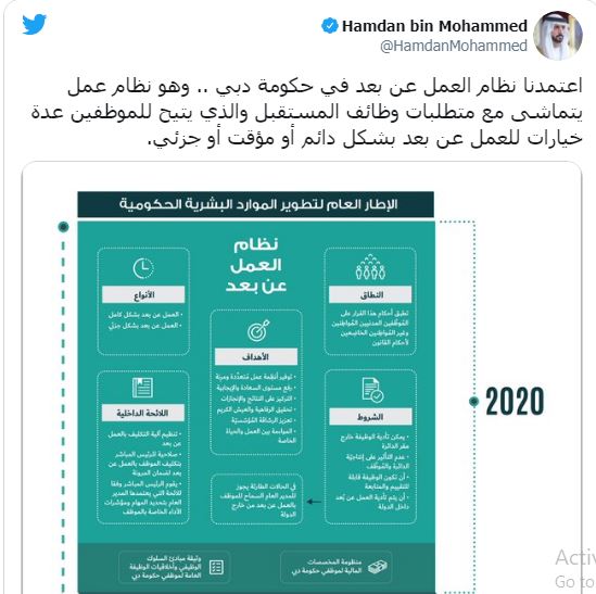 اعتمد ولي عهد دبي، رئيس المجلس التنفيذي، حمدان بن محمد بن راشد آل مكتوم، نظام العمل عن بعد في حكومة دبي.