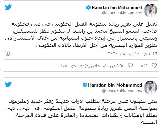 وقال ولي عهد دبي في سلسلة من التغريدات على حسابه في "تويتر": "نحن مقبلون على مرحلة تتطلب أدوات جديدة وفكرا جديدا وملتزمون بمواصلة العمل لتعزيز ريادة منظومة العمل الحكومي في دبي، دبي تملك الإمكانات والكفاءات المتجددة والقادرة على قيادة المرحلة المقبلة".