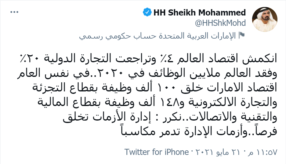 ونشر الشيخ محمد بن راشد في تغريدة على "تويتر"، اليوم السبت، كتب فيها: "انكمش اقتصاد العالم 4% وتراجعت التجارة الدولية 20%، وفقد العالم ملايين الوظائف في 2020".