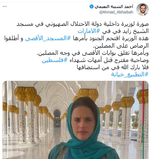 ونشر رئيس الرابطة الإمارتية لمقاومة التطبيع أحمد الشيبة النعيمي صورة لوزيرة داخلية الاحتلال في المسجد على صفحته بتويتر، وعلق عليها قائلاً "هذه الوزيرة اقتحم الجنود بأمرها المسجد الأقصى، وأطلقوا الرصاص على المصلين، وبأمرها تغلق بوابات الأقصى في وجه المصلين، وصاحبة مقترح قتل أمهات شهداء فلسطين، فلا بارك الله في من استضافها".